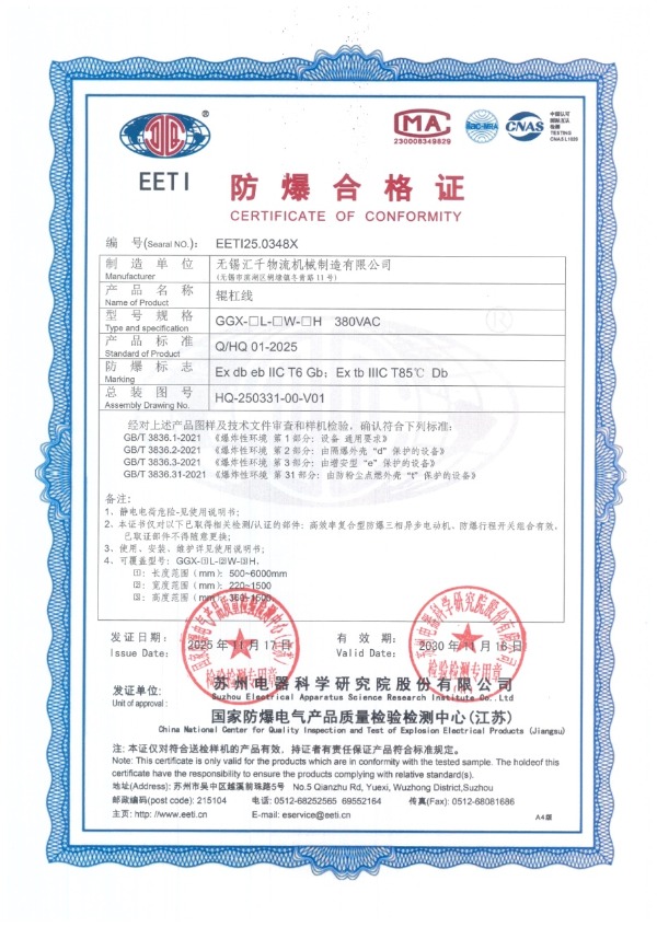 Niedawno główny produkt Wuxi Huiqian Logistics Machinery Manufacturing Co., Ltd. – przenośnik rolkowy – pomyślnie przeszedł rygorystyczne testy i oficjalnie uzyskał certyfikat przeciwwybuchowości EETI! Certyfikat ten oznacza, że zabezpieczenie przeciwwybuchowe przenośnika rolkowego Huiqian spełnia uznane międzynarodowe standardy bezpieczeństwa, zapewniając bardziej niezawodne rozwiązanie do transportu materiałów dla branż wysokiego ryzyka, takich jak petrochemia, górnictwo węglowe, farmaceutyka i przemysł wojskowy, a także demonstrując duże możliwości techniczne firmy w dziedzinie przeciwwybuchowego sprzętu logistycznego.