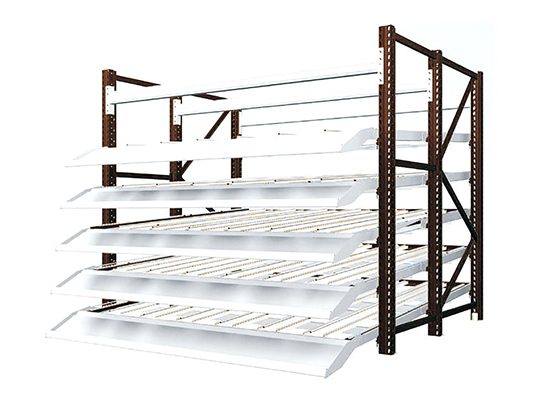 Płynne półki są ogólnie konstruowane przy użyciu stopu aluminium typu wałowego lub płynów z blachy na półkach średniej do lekkich, z płynami płynnymi na około 3 stopnie. Towary przenoszone przez płynne półki są zwykle pakowane w papier lub umieszczane w plastikowych obrotach w środku, wykorzystując własną wagę do osiągnięcia przepływu i z towarów, dzięki czemu przechowywanie i dostęp jest wygodny. Pojemność obciążenia jednostkowego płynnych półek wynosi zwykle około 100 kg na warstwę, a wysokość półki wynosi 2,5 metra. Płynne półki są odpowiednie do konwersji procesu po obu stronach linii montażowych, produkcji linii montażowej i operacji wybierania w centrach dystrybucji. Mogą być wyposażone w elektroniczne znaczniki do osiągnięcia informacji o towarach. Powszechnie stosowany w branżach takich jak motoryzacyjny, farmaceutyczny, chemiczny i elektroniczny.