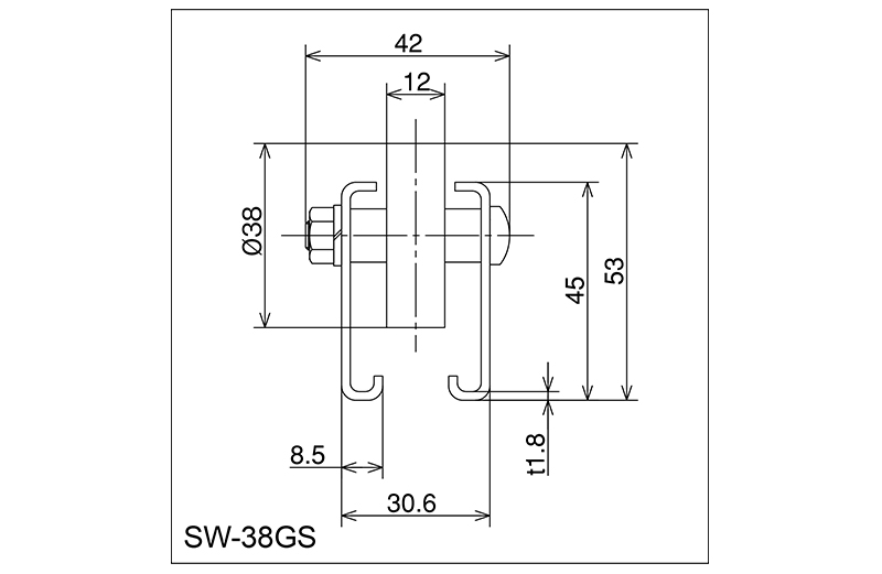 | SW-38GS | 38 × 12 × 6 × 27 | M6 × 38L | 45 × 31 × 8,5 × 42 × 1,8 | 53 | 1800 · 2400 · 3000 | 50,75 · 100 · 150 | 30 | POM |